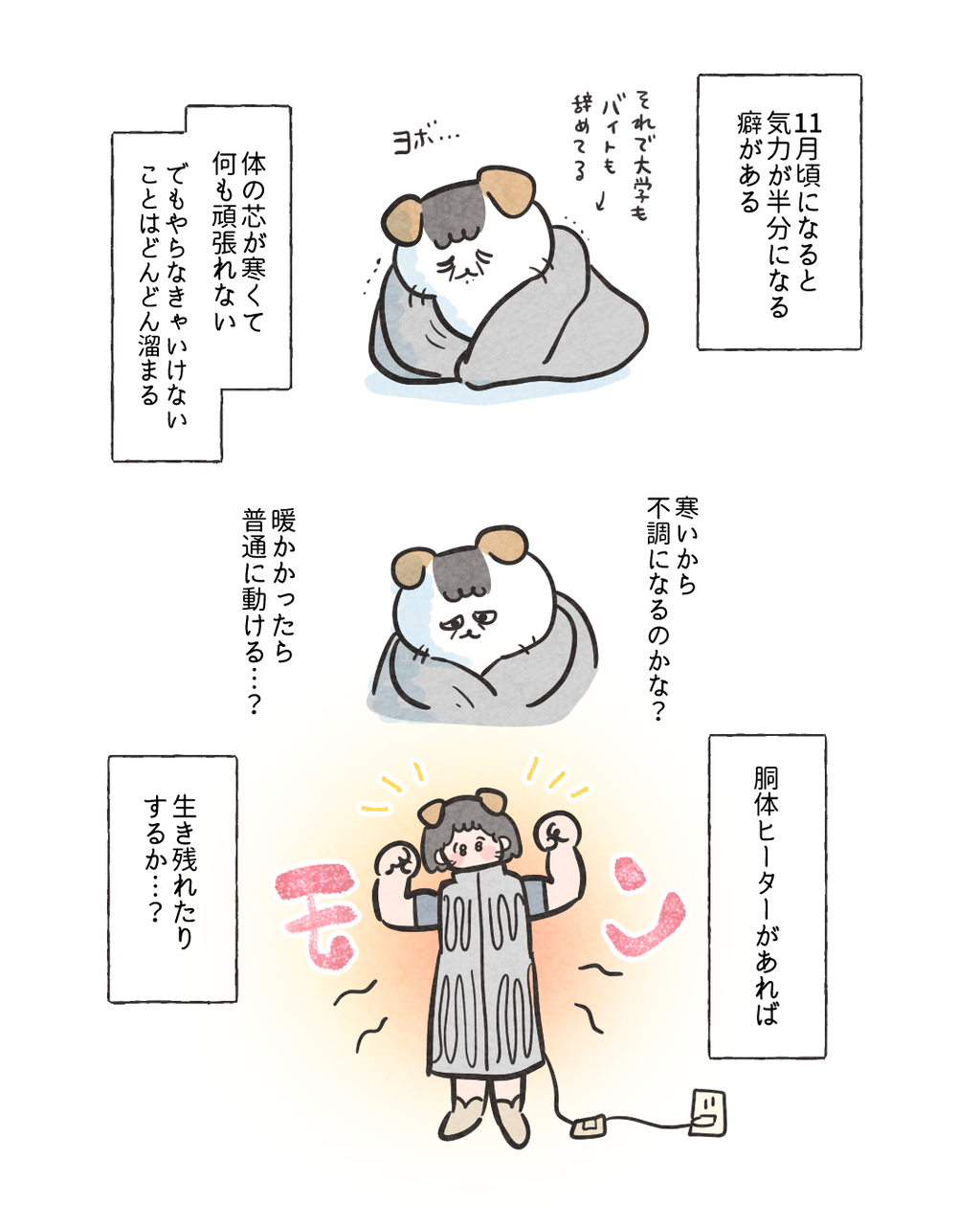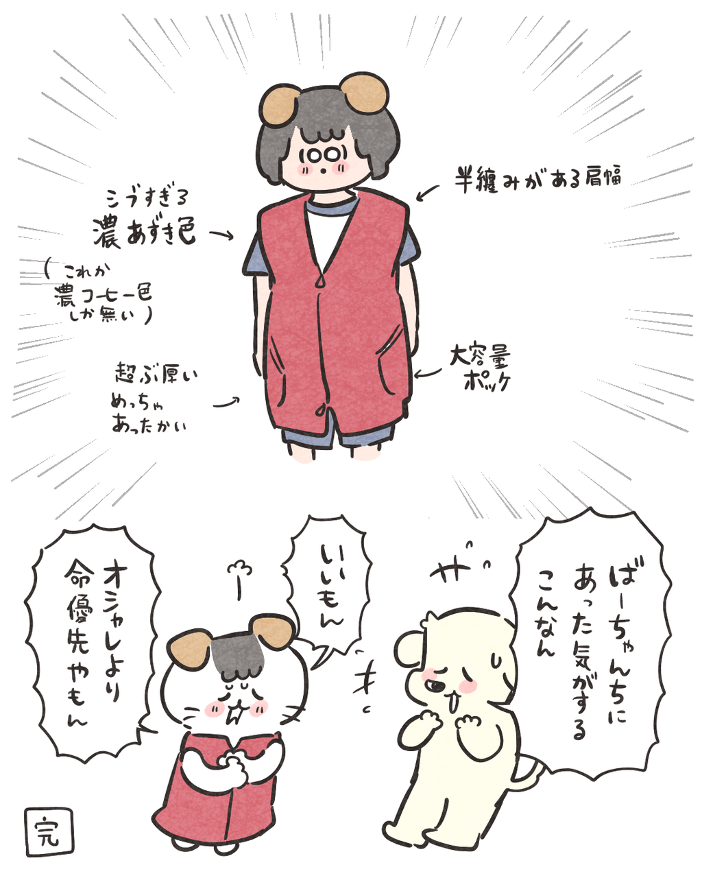 寒くて辛いので買った大人用スリーパーが良かったけど 2024/12/14 10:00 これ着てゴミ出しはムリAIにぼかしてもらった私と半纏ですとっても暖かくて分厚くて気持ちいい😌それで気力が回復したかと言われるとそうでも無かったです😪どうしたらいいのか…毎日日光浴すべきなのか🤔 「買ってよかったもの」カテゴリの最新記事 タグ :#マヨ#買ってよかったもの < 前の記事次の記事 > コメント コメント一覧 (6) 1. 41歳@むすめ2歳11ヶ月 2024/12/14 11:12 養命酒いいかも!!?? ホットミルクもよさげヽ(=´▽`=)ノ 0 ハズレ(マヨ) がしました 3. ハズレ 2024/12/14 19:16 >>1 41歳@むすめ2歳11ヶ月さん 養命酒!!🤔 調べてみます‼️ 0 ハズレ(マヨ) がしました 2. 謎 2024/12/14 14:07 何で寒いハズなのに半袖を?! 0 ハズレ(マヨ) がしました 4. ハズレ 2024/12/14 19:17 >>2謎さん この日はそんなに寒くなかったんですぅ…😭笑 0 ハズレ(マヨ) がしました 5. hitomi 2024/12/14 21:10 いっそ着る毛布で全身包まれるとよいのでは…!? と思いました☺️ 暖かくしてご自愛くださいね💓 0 ハズレ(マヨ) がしました 6. ハズレ 2024/12/15 11:21 >>5 hitomiさん ありがとうございます🥹 全身も考えたんですけど腕は出しておきたい派なんです🥹 なんだか可動域が狭まる気がして🥺(?) 0 ハズレ(マヨ) がしました コメントフォーム 名前 コメント 記事の評価 リセット リセット 顔 星 情報を記憶 コメントを投稿する