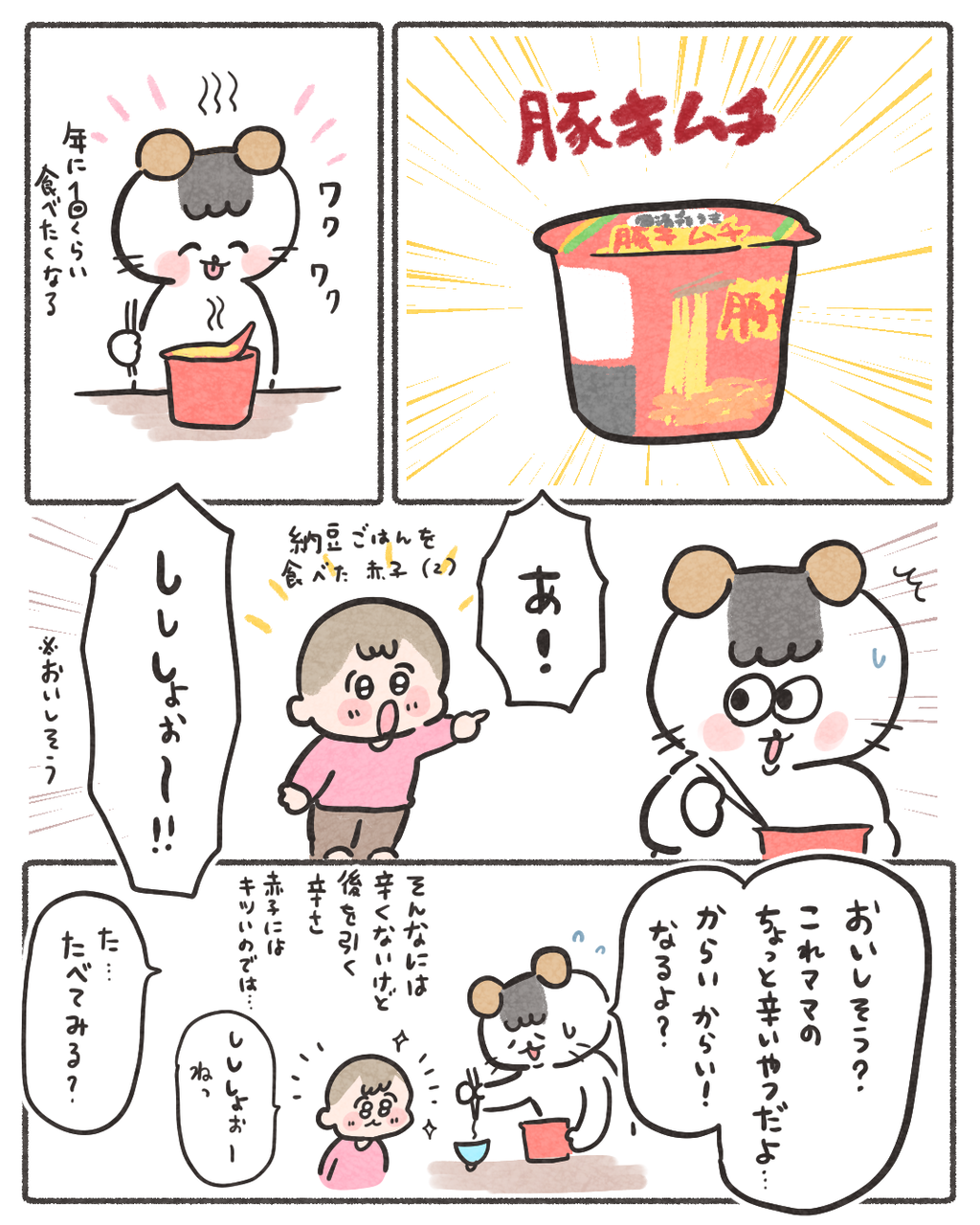 2歳児が辛いもの食べた時の反応 2024/12/23 10:00 麺4本くらいは食べました🤔 「日常」カテゴリの最新記事 タグ :#コイチャン#育児漫画#2歳#ごはん < 前の記事次の記事 > コメント コメント一覧 (2) 1. 名無し 2024/12/23 11:33 うちも辛いものも食べたがるし、私の飲みかけのブラックコーヒーも飲みたがります。私に見えないと思って、こっそりコーヒー飲んで満足そうに「うん、うん」ってうなずいてたりして可愛くて笑っちゃいます。ならピーマン🫑とか食べられるんじゃ?と思うんですが、それは「いなない。」と断るんですよね。 0 ハズレ(マヨ) がしました 2. ハズレ 2024/12/23 14:06 >>1 名無しさん 可愛い…😭なんでブラックいけるのにピーマンはダメなのか😭 0 ハズレ(マヨ) がしました コメントフォーム 名前 コメント 記事の評価 リセット リセット 顔 星 情報を記憶 コメントを投稿する