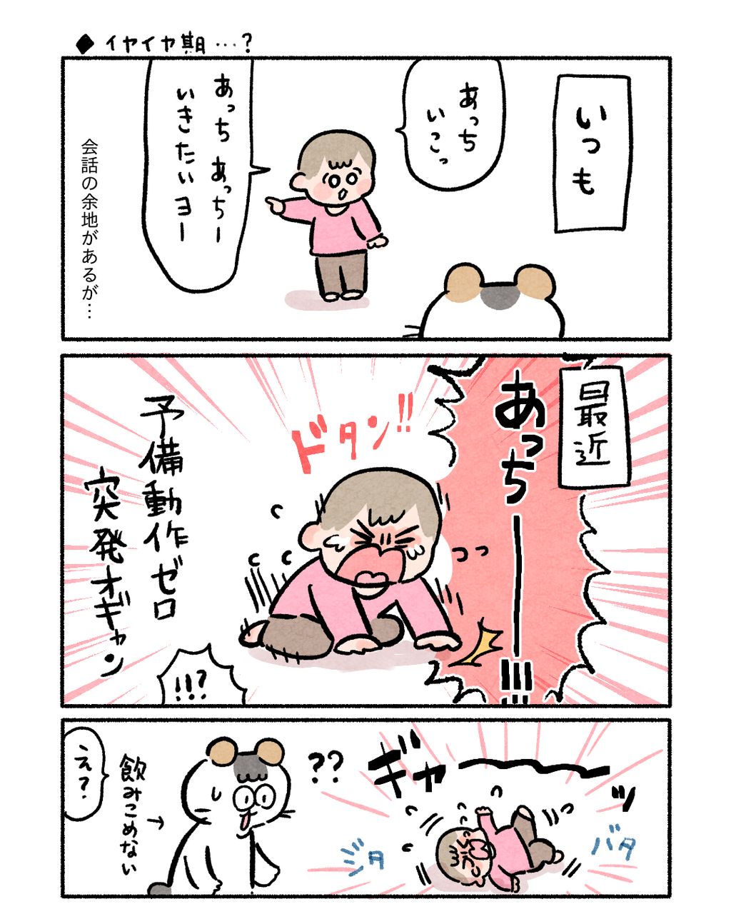 予備動作ゼロ突発オギャン期 2025/02/26 07:00 2週間くらい凄まじいオギャンを発揮しましたがその後すぐに鎮火し大人しいバブちゃんに戻ったということです 「日常」カテゴリの最新記事 タグ :#コイチャン#育児漫画#2歳#イヤイヤ期 < 前の記事次の記事 > コメント コメントフォーム 名前 コメント 記事の評価 リセット リセット 顔 星 情報を記憶 コメントを投稿する