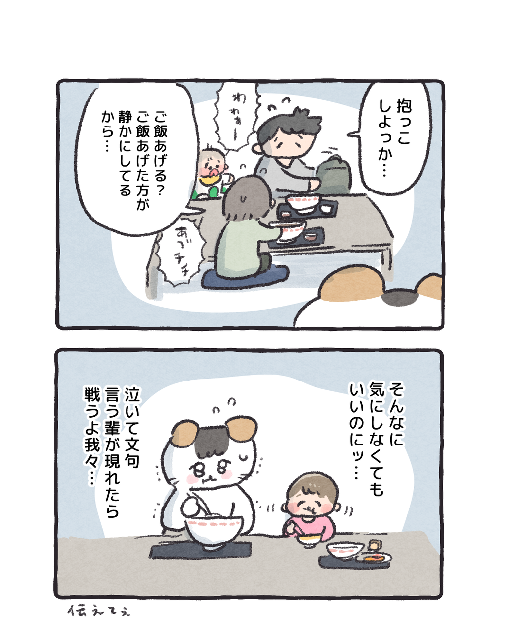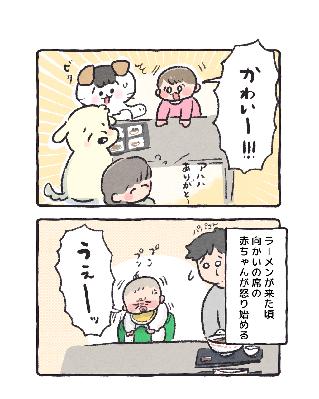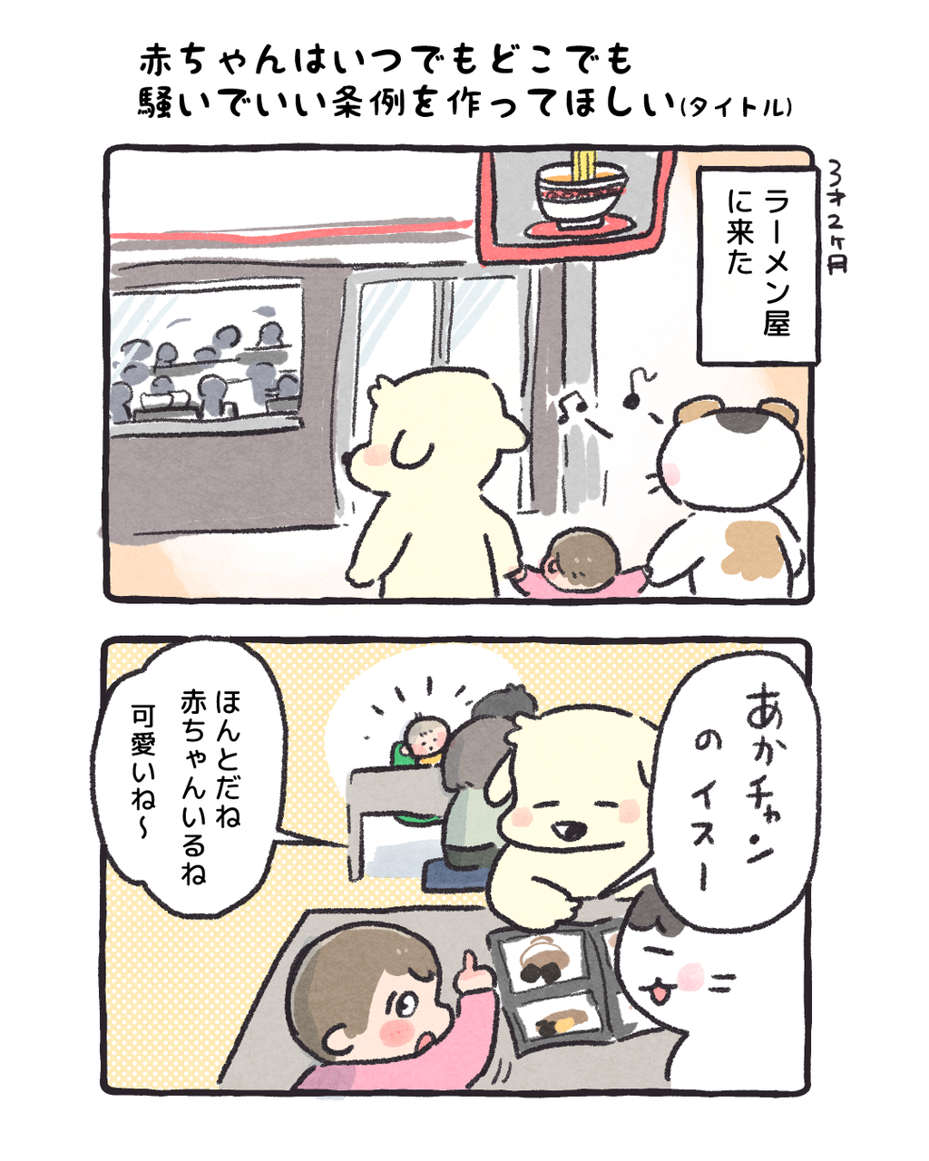 赤ちゃんはどこで騒いでもいいでしょ 2026/02/07 08:00 この後ずっと交代で抱っこしてあやしてた🥺でも怖いよね 🥲わかるどこに心の狭くて我慢ができない人がいるか分からないしね自衛するに越したことはないけどなんで大人のために子供に我慢させなきゃならないのか…🙂 「日常」カテゴリの最新記事 タグ :#コイチャン#育児漫画#3歳 < 前の記事次の記事 > コメント コメント一覧 (7) 1. 最強無敵無頼丸 2026/02/07 20:47 私も戦います!みんなが安心してご飯が食べられますように! 0 ハズレ(マヨ) がしました 2. ハズレ 2026/02/07 21:42 >>1 最強無敵無頼丸さん うおおお‼️😭💪赤子一揆💪💪 0 ハズレ(マヨ) がしました 3. ゆきの 2026/02/08 04:11 子が2歳の頃、電車の中で背中合わせで立ってた長い髪を縛ってるオバハンの毛に向かって「お母さんみたいねぇ」って言った後、大きい声で「お母さん」の歌歌ってたらオバハンにめっちゃ怖い顔とジェスチャーつきで「しぃっ!!!」て言われた事があって(色んな意味で怖過ぎて私は謎にすみません(躾けてくれて)ありがとうございます!て言いました😂) オバハン子供の意図分からんかったならごめんと思うし、親の私がピシッと叱れたら良かったと思う気持ちもあり、 それから私も人が多いところではラーメン赤ちゃん家族と同じ感じになります😢 95%くらいは暖かい対応してくれるのですが、5%に怯えて生きてます。。 赤ちゃんはどこでもいつでも騒いだり泣いていい権利ほしいーーーと思いました😭😭 0 ハズレ(マヨ) がしました 5. ハズレ 2026/02/08 16:14 >>3 ゆきのさん ほんと😭5%が怖いですよね!! 叱ってわかる歳じゃないのにっ😭 赤ちゃんにもしつけ!って言う人にはタコは3歳並みの知能なんだからしつけてみろ!!って話ですよね…😭😭 0 ハズレ(マヨ) がしました 7. ゆきの 2026/02/09 07:32 >>5 タコ3歳の知能あるんですか!!逆にタコすごい!笑 なるほど、それは無理だし段々我が子がタコに見えてきました😂 ほんとタコしつけてほしい💢🦑 0 ハズレ(マヨ) がしました 4. おかゆ 2026/02/08 10:10 我が家にも9ヶ月の赤ちゃんがいて 本当にこんな感じで外食してます😔 泣いても大丈夫だよ〜って思ってくれてる人がいると思うだけで 心強いです😊 0 ハズレ(マヨ) がしました 6. ハズレ 2026/02/08 16:16 >>4 おかゆさん ヌオオン😭 いのちを守っているだけなのに😭 外食も落ち着いてできない世界ッ…😭ギルティ… 0 ハズレ(マヨ) がしました コメントフォーム 名前 コメント 記事の評価 リセット リセット 顔 星 情報を記憶 コメントを投稿する